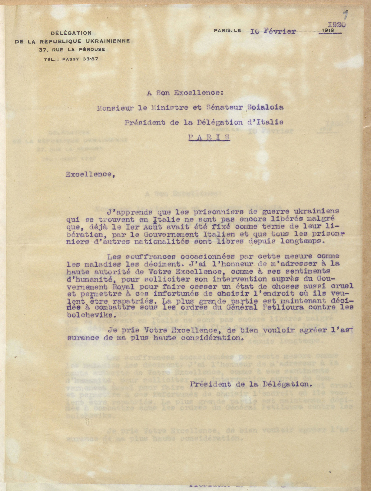 про звільнення українських військовополонених. Париж, 10 лютого 1920 р.