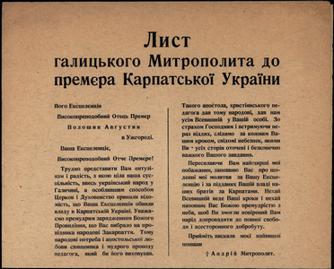Вітальний лист митрополита Андрея Шептицького до прем’єра Карпатської України о. Августина Волошина. 1938 р.