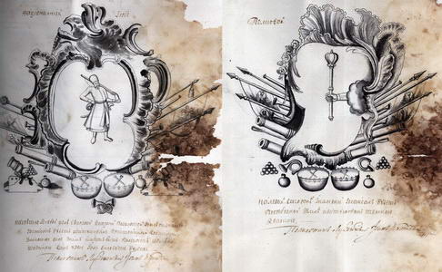 1758 р., лютого 9. – Донесення полковника Петра Розумовського та полкової старшини про виділення коштів на прапори для новоутворених Четвертої полкової, Заньківської та Попівської сотень Ніжинського полку та уточнення питань про колір прапорів та зображення на них гербів: “какого цвета знамена в силу высоких Вашей Ясневельможности универсалов яко то Четвертую полковую, Занковскую и Поповскую и оправить и какому гербу на них быть повелено будет … суть и на оных знаменах гербу с правой стороны быть национальному, а с другой стороны тех знамен – сотенных, … а цвету тем корогвам быть голубому…”.