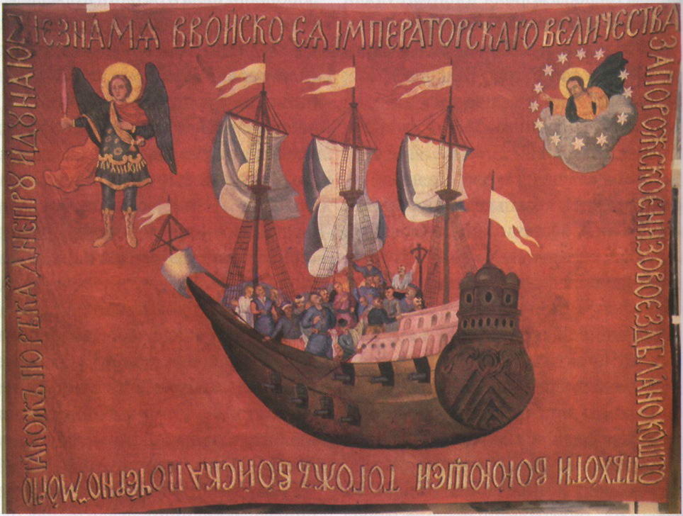 Традиційно кольором прапорів Запорозької Січі вважався малиновий, але як свідчать документи, запорожці не цуралися і блакитного – в 1763 р. кошовий отаман Петро Калнишевський просив замовити у київських майстрів прапор блакитного кольору: “…войсковое знамя на блакитном канаваце в подобие имеющегося при Коше … со изображением на нем гербов: с одной стороны – Св. апостолов Петра и Павла и между ними церкви, с другой – большого орла, а на нем с мечем архистратига Михаила… ”.
