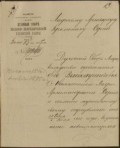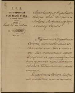 1895 р., липня 12. – Наказ (“предписание”) Духовного Собора архіваріусу Києво-Печерської лаври ієромонаху Сергію про проведення описування справ архіву та складання описів та “алфавитов” з метою “устранения повторяющихся случаев замедления в отыскании требуемых дел, хранящихся в Лаврском архиве, вследствие неправильно составленых описей сим делам, а также совершенного отсутствия относящегося к ним алфавита…”.
