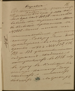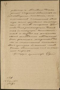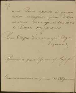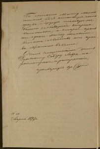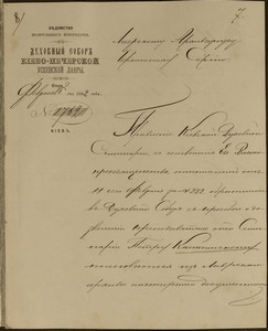 1892 р., жовтня 6. – Повідомлення Духовного Собора архіваріусу Києво-Печерської лаври ієромонаху Сергію про видання дозволу на проведення дослідження та користування окремими справами архіва студенту IV курсу Київської Духовної академії Олександру Радзієвському “для составления кандидатского сочинения”.
