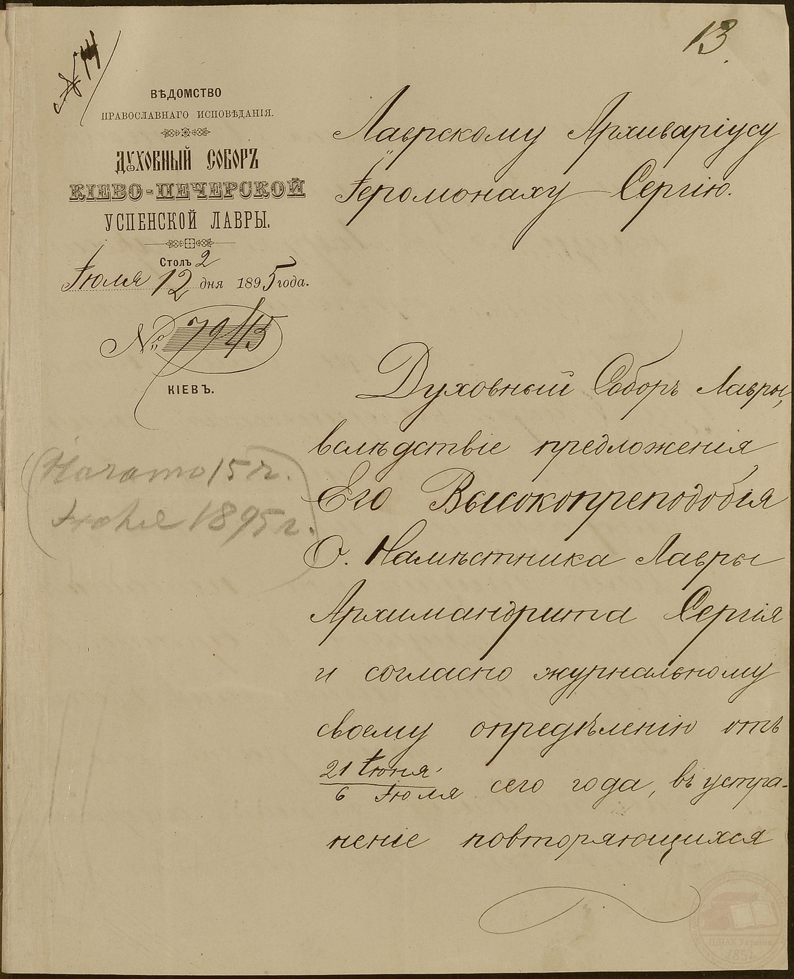 1895 р., липня 12. – Наказ (“предписание”) Духовного Собора архіваріусу Києво-Печерської лаври ієромонаху Сергію