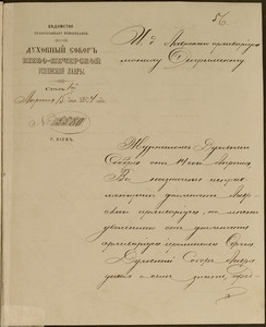 1903 р., листопада 15. – Повідомлення Духовного Собора архіваріусу Києво-Печерської лаври ієромонаху Сергію про передавання до архіву із бібліотеки 39-ти зв’язок паперів, отриманих після смерті митрополита Платона.