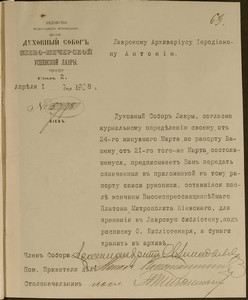 1908 р., квітня 1. – Наказ (“предписание”) Духовного Собора архіваріусу Києво-Печерської лаври ієродиякону Антонію про передавання до бібліотеки з архіву опису рукописів, отриманих після смерті митрополита Платона. Опис рукописів митрополита Платона.