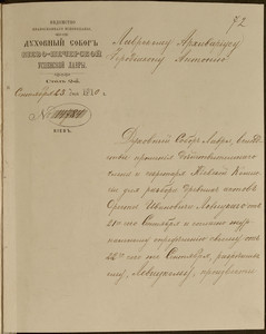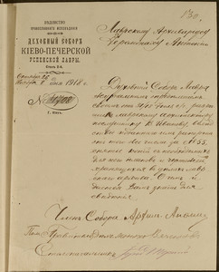 1910 р., вересня 23. – Повідомлення Духовного Собора архіваріусу Києво-Печерської лаври ієродиякону Антонію про видання дозволу на проведення дослідження та ознайомлення зі справами XVIII століття лаврського архіва дійсному члену та секретарю Київської комісії для розбору давніх актів Оресту Левицькому.