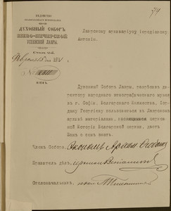 1911 р., лютого 15. – Повідомлення Духовного Собора архіваріусу Києво-Печерської лаври ієродиякону Антонію про видання дозволу на проведення дослідження та ознайомлення зі справами лаврського архіва директору етнографічного музею в м. Софія (Болгарське князівство) Іордану Георгієву.
