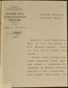 1913 р., грудня 19. – Повідомлення Духовного Собора архіваріусу Києво-Печерської лаври ієродиякону Антонію про доручення монаху Іпполиту проводити в книгах бібліотеки та документах архіву “выкопировку водных бумажных знаков” під керівництвом завідуючого Центральним архівом давніх актів Івана Каманіна.