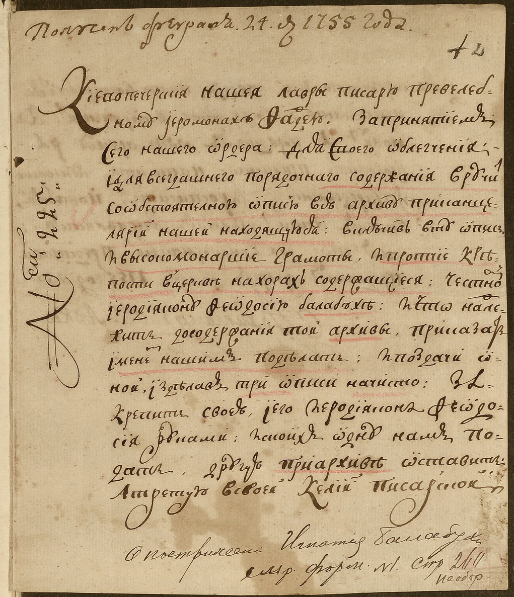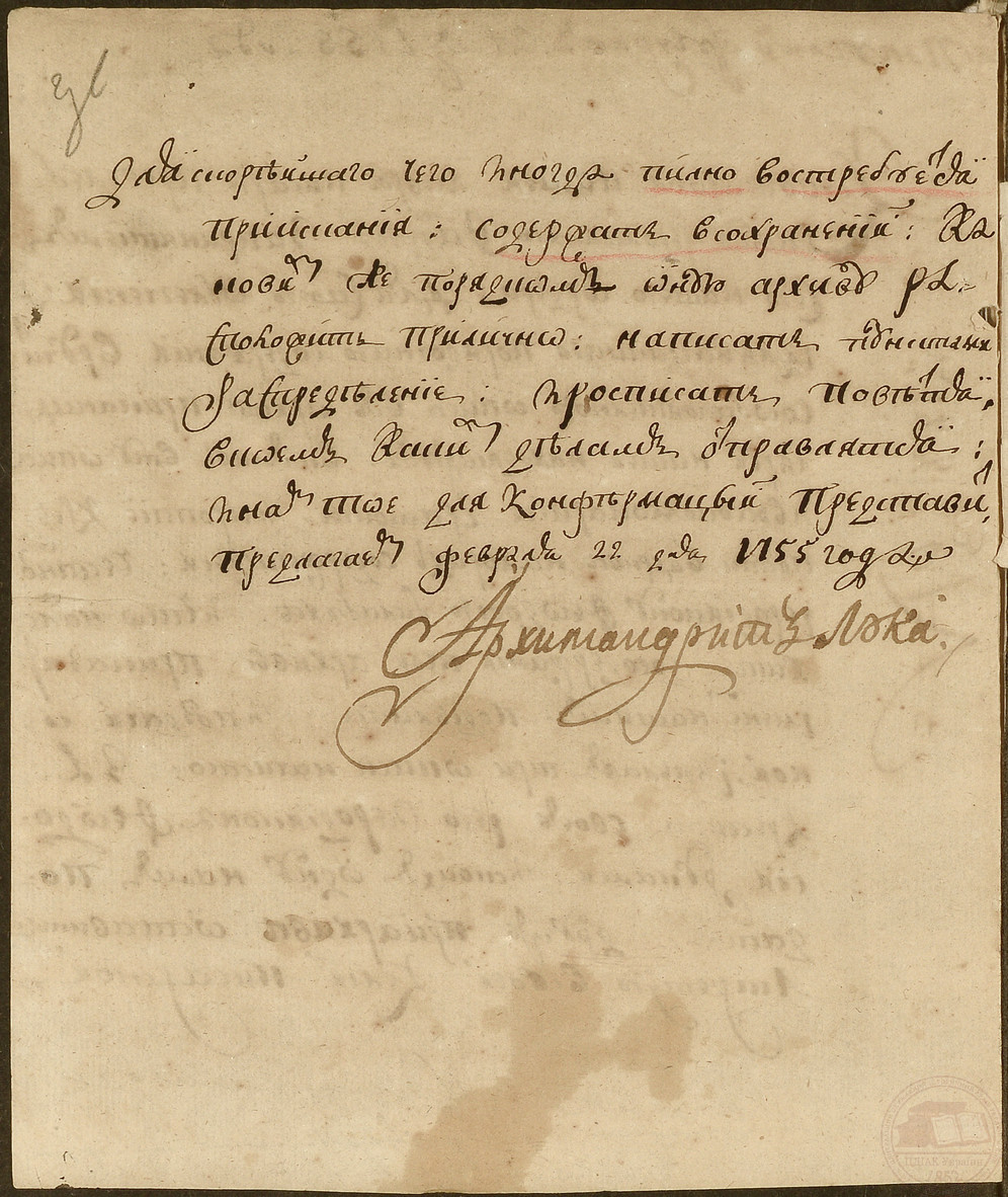 1755 р., лютого 22. – Розпорядження архімандрита Луки (Білоусовича) призначити ієродиякона Феодосія Балабуху упорядковувати лаврський архів: розібрати справи, скласти на них описи та тримати документи в усталеному порядку.